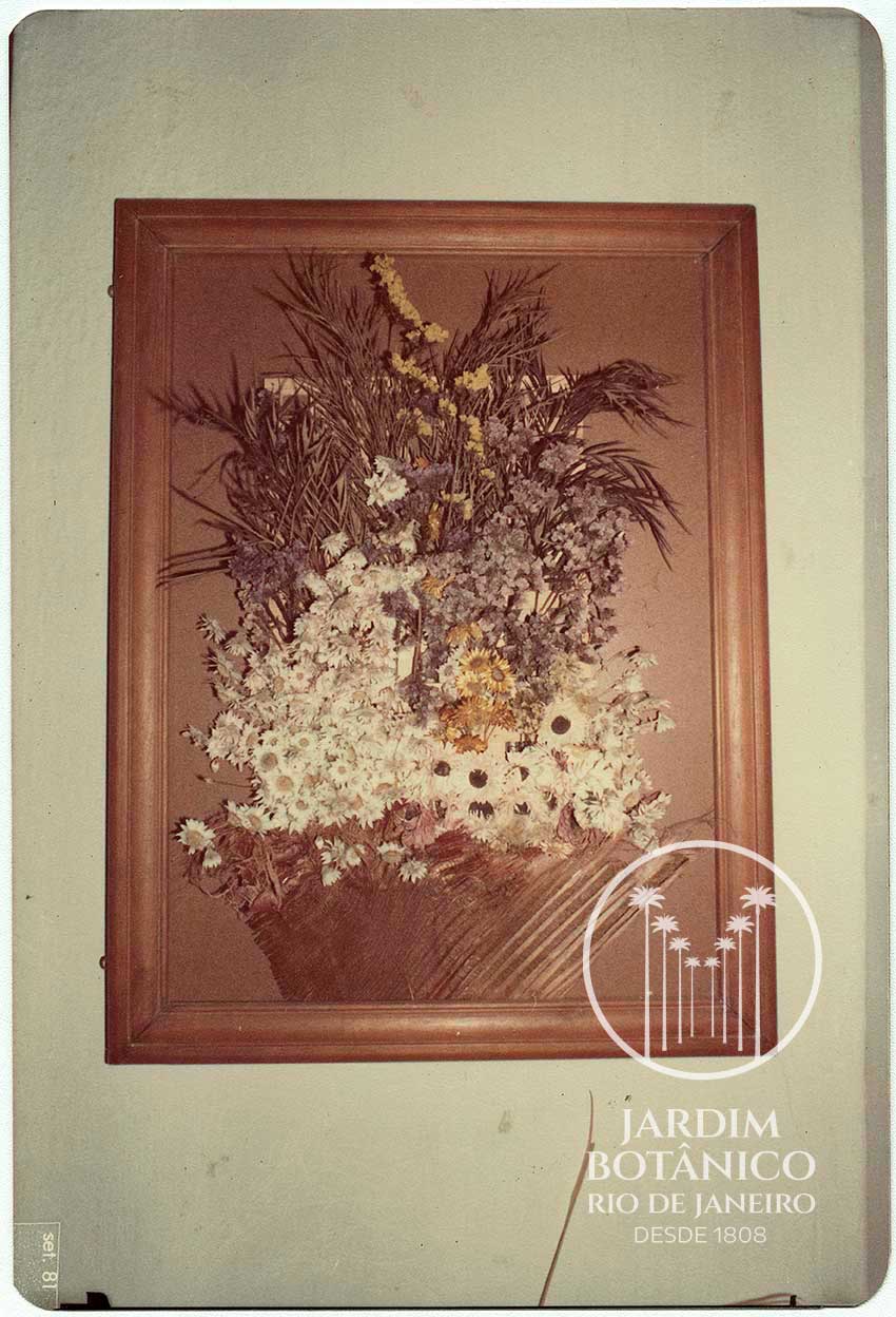 Museu Botânico Kuhlmann. Exposição '' A Primavera'' Data 21/09/1981. Quadro artesanal feita pela diretora-substituta Hilda Manhã Ferreira; flores sempre vivas, vaso fibra de palmeira, folha de proteaceae e fundo eucatex com treliça de madeira.