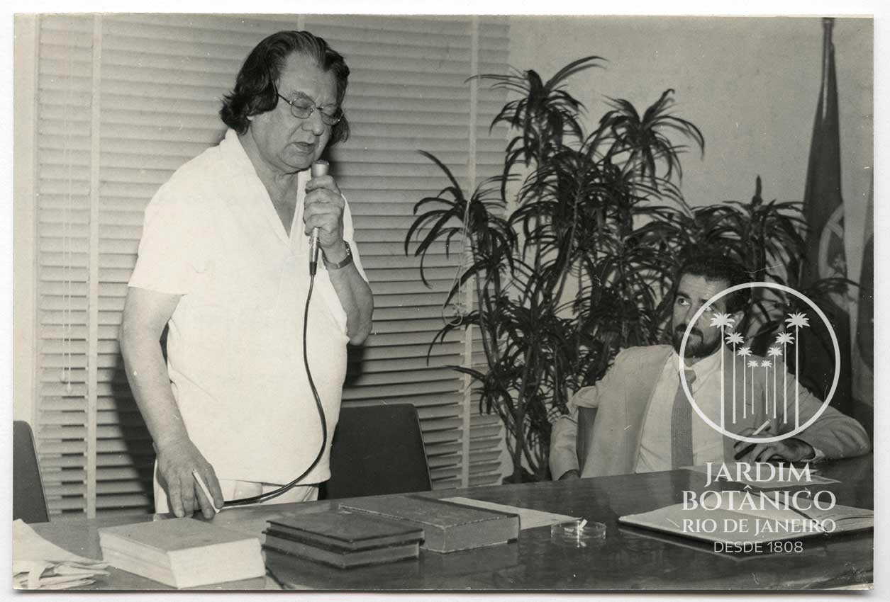 Palestra do Dr. Honório Monteiro, sobre as Comemorações de Aniversário da Fundação do JB, que comemorou 175 Anos. Local: Salão Nobre do JB, ao seu lado se encontra o Sr. Diretor do JB Dr. Carlos Xavier. Ficha N° 128.