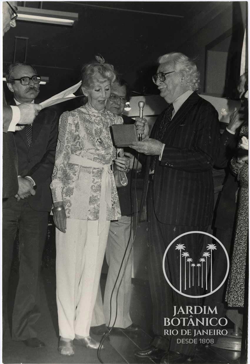 Exposição de pintura de Margaret Mee sobre '' Flores do Amazonas'' patrocionada pelo Jardim Botânico do Rio de Janeiro e pelo conselho Britânico. Local: Salão D. João VI. Cynthia Kremer, 23/08/83. Exposição das Flores do Amazonas por Margaret Mee, ao seu lado o paisagista Burle Marx. Ficha 130.