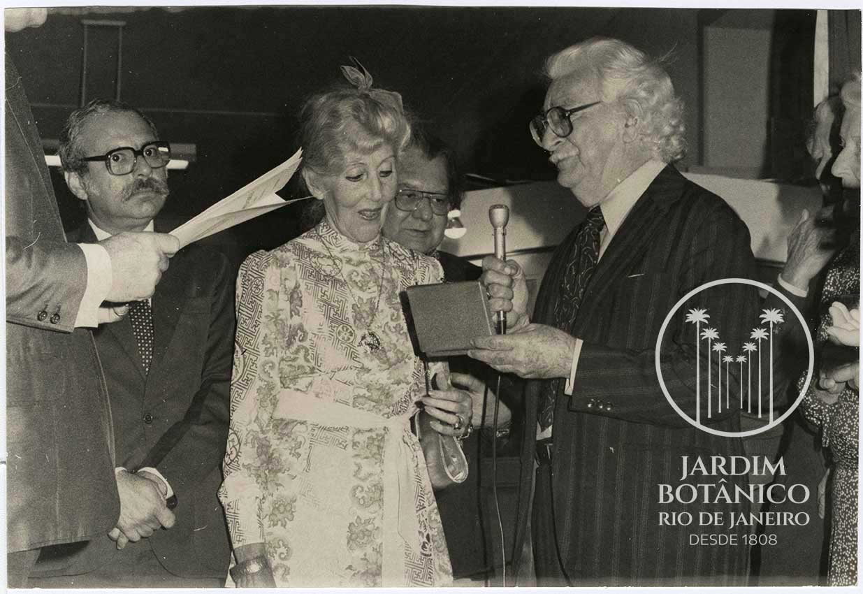 Exposição de pintura de Margaret Mee sobre '' Flores do Amazonas'' patrocionada pelo Jardim Botânico do Rio de Janeiro e pelo conselho Britânico. Local: Salão D. João VI. Cynthia Kremer Vieira, 23/08/83. Exposição das Flores do Amazonas por Margaret Mee, ao seu lado o paisagista Burle Marx. Ficha 130.